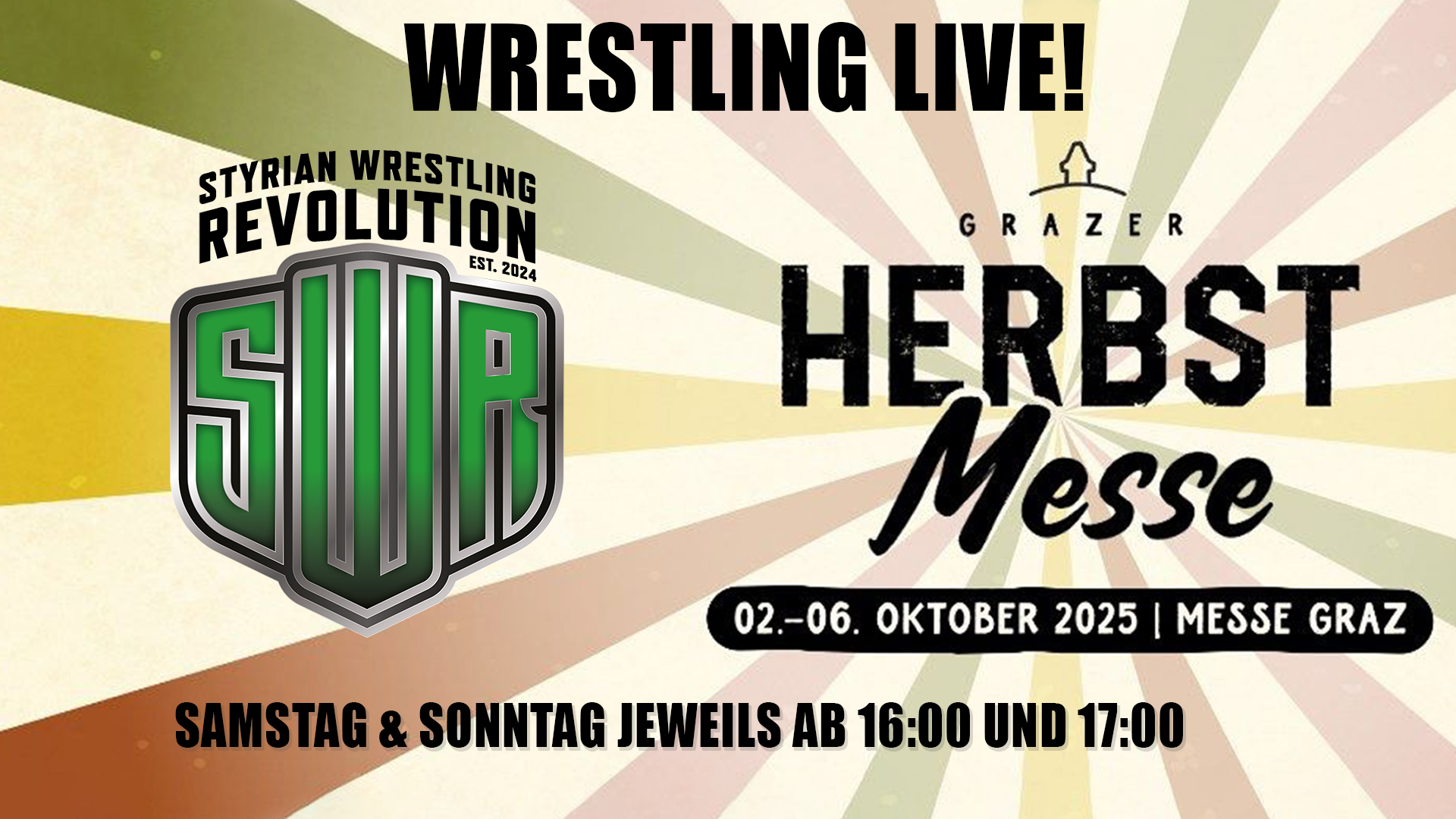 Stadthalle Graz Messeplatz 1, GrazDie Styrian Wrestling Revolution wird auch dieses Jahr wieder auf der Grazer Herbstmesse 2025 vertreten sein. Samstag und Sonntag wird es jeweils 2 Kämpfe ab 16 und ab 17 Uhr geben.